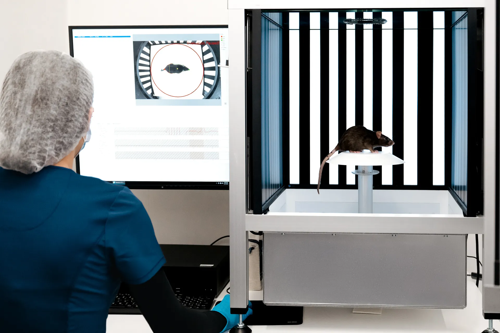 Experimentica provides advanced behavioral assessment and optomotor response (OMR) testing to evaluate visual acuity (VA) and contrast sensitivity (CS) in rodent models. Utilizing the state-of-the-art OptoDrum system (Striatech GmbH, Germany), this non-invasive, automated method enables precise measurement of visual thresholds by observing the optomotor response to moving visual stimuli, ensuring objective and reliable assessment of VA and CS.